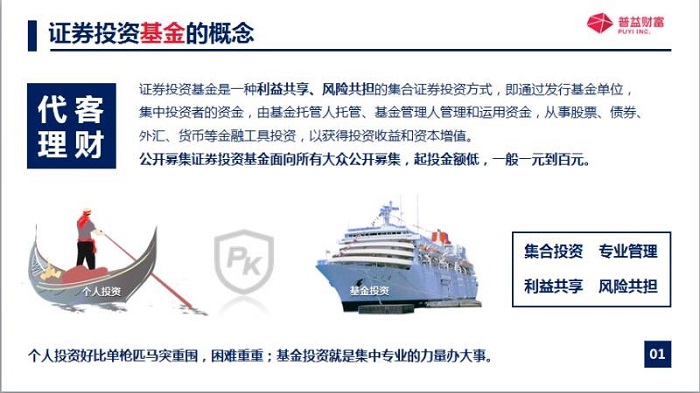 把這些資金呢投資于股票債券外匯貨幣等金融工具的一種集合投資方式,也就是說不止投資單一只股票,也不止投資單一只債券,而是投資多只股票或者多只債券的一種集合投資方式,極大地分散的風(fēng)險,因為咱們都知道雞蛋不能放在同一個籃子里面,并且呢,公募基金是面向所有大眾公開募集的,起投金額是比較低的,一元起投呀,百萬元起投呀,千元起投。這對于很多投資者來說呢,都是可以接觸的到的,那如果說拿個人投資跟基金投資進行比較的話,就像在海里面航行一樣,個人投資就像一個孤身備戰(zhàn)的小姑船一樣,那基金投資,因為它背后有一整個團隊進行運作,那他的專業(yè)非常強,所以呢,它就是集中專業(yè)的力量辦大事。