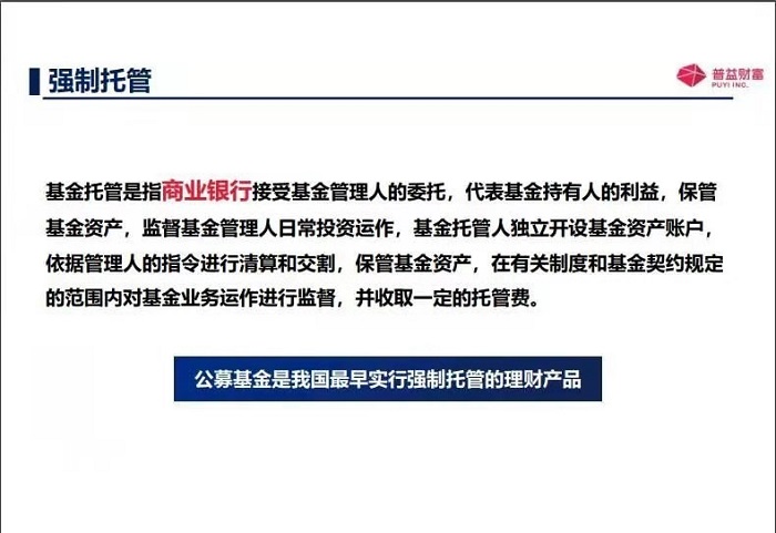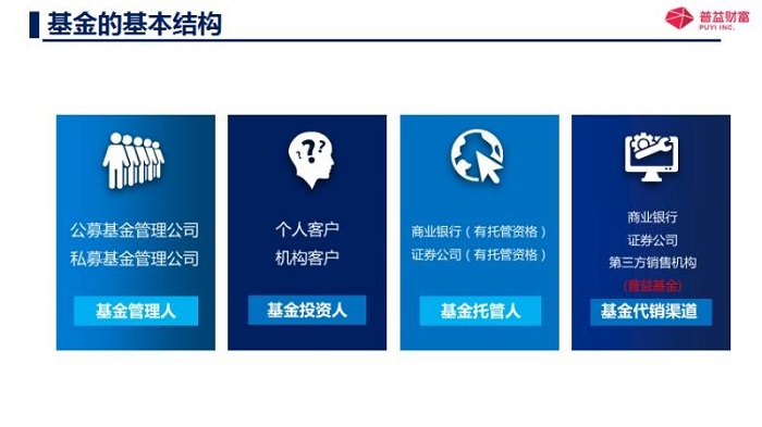 那另外一個呢,基金投資人就是咱們普通老百姓,也是基金投資人呢,還有機構(gòu)投資者,那另外一個就是基金托管人,就是來保管著咱們資金的安全的就是基金托管人,第一班是有商業(yè)銀行或者證券公司,他們還必須得有托管的資質(zhì),當(dāng)然了,還有基金代銷機構(gòu),也就是去銷售基金的,比如說一些商業(yè)銀行呀,證券公司呀,期貨公司呀,還有一些第三方的獨立的基金代銷機構(gòu),像咱們的普益基金就是基金代銷機構(gòu)。