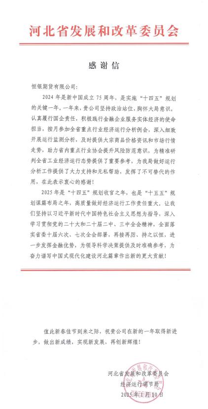 近日,河北省發(fā)展和改革委員會(huì)經(jīng)濟(jì)運(yùn)行調(diào)節(jié)局向恒銀期貨發(fā)來(lái)感謝信。信中對(duì)恒銀期貨踐行國(guó)有金融企業(yè)服務(wù)實(shí)體經(jīng)濟(jì)的使命擔(dān)當(dāng)、深入細(xì)致開(kāi)展運(yùn)行監(jiān)測(cè)分析、及時(shí)提供大宗商品價(jià)格資訊和市場(chǎng)行情走勢(shì)、助力省內(nèi)重點(diǎn)行業(yè)協(xié)會(huì)提升風(fēng)險(xiǎn)防范意識(shí)、協(xié)助研判全省工業(yè)經(jīng)濟(jì)運(yùn)行態(tài)勢(shì)等工作表示感謝,并對(duì)恒銀期貨2025年工作提出了期望和要求。