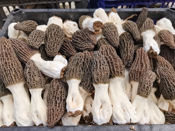 該基地占地25畝,初建有大棚27座。自去年11月播種以來,羊肚菌長勢(shì)良好,4月份已陸續(xù)開始出菇,種植戶們沉浸在羊肚菌收獲的喜悅之中,大棚內(nèi)一朵朵羊肚菌破土而出,乳白色的菌柄撐起蜂窩狀的菌蓋,煞是喜人。大家滿懷喜悅的采摘羊肚菌,去根、烘烤、挑選、打包,做著銷售前的準(zhǔn)備,一片繁忙歡快的景象。